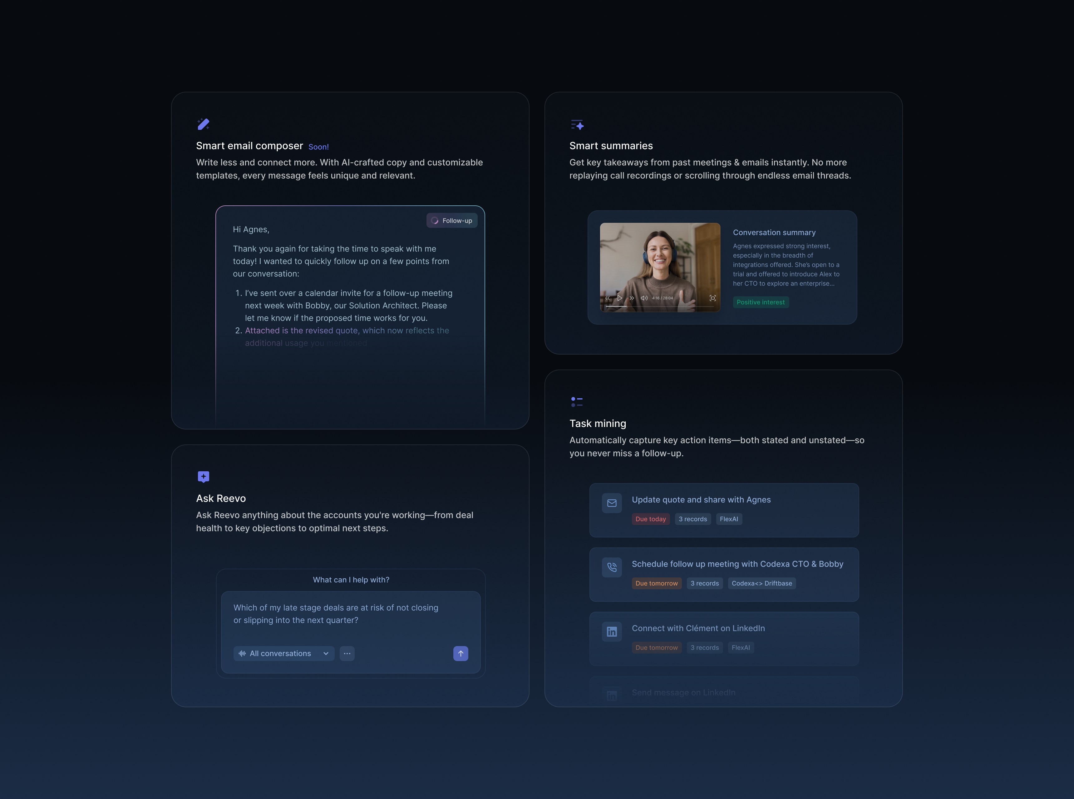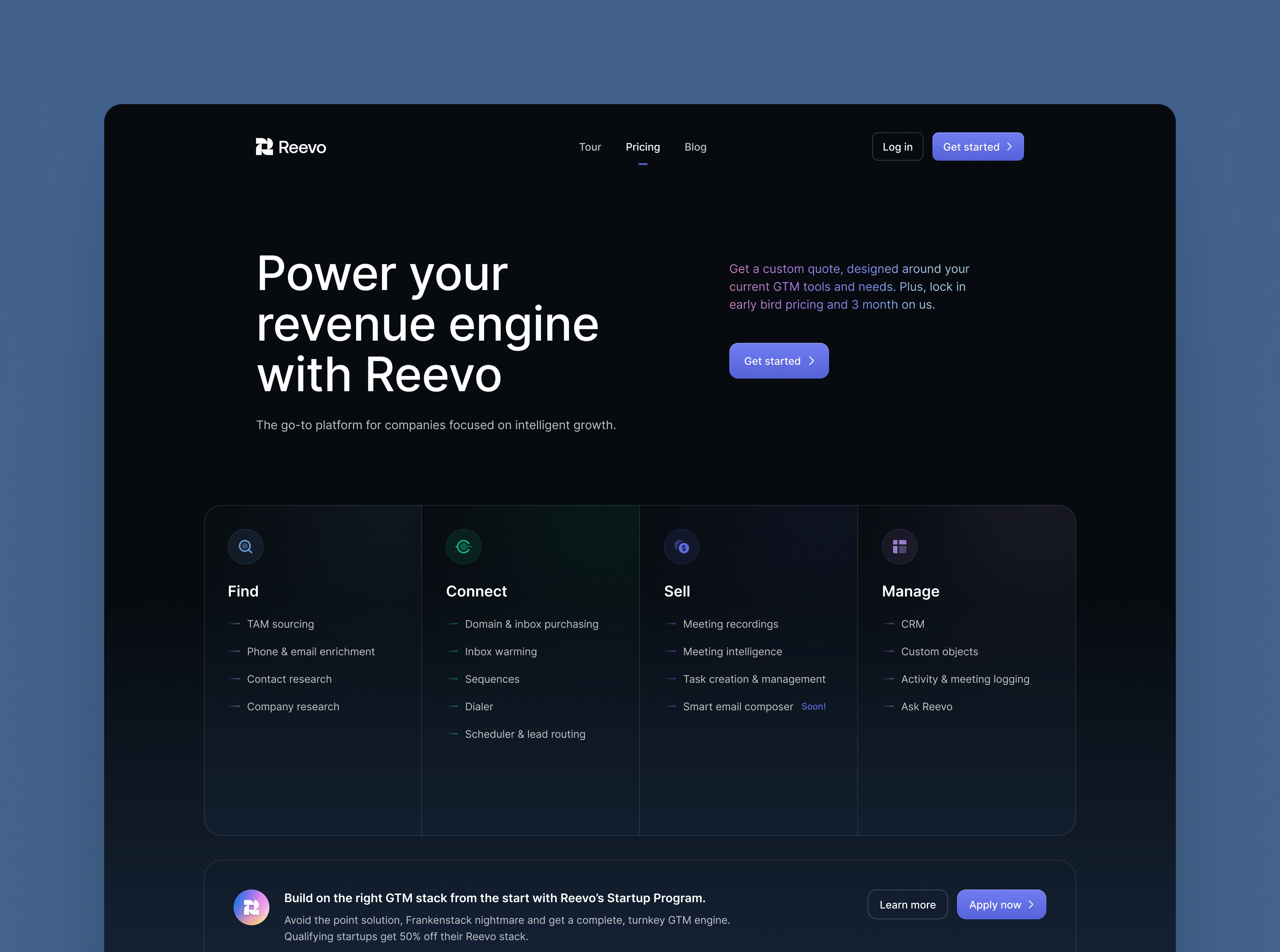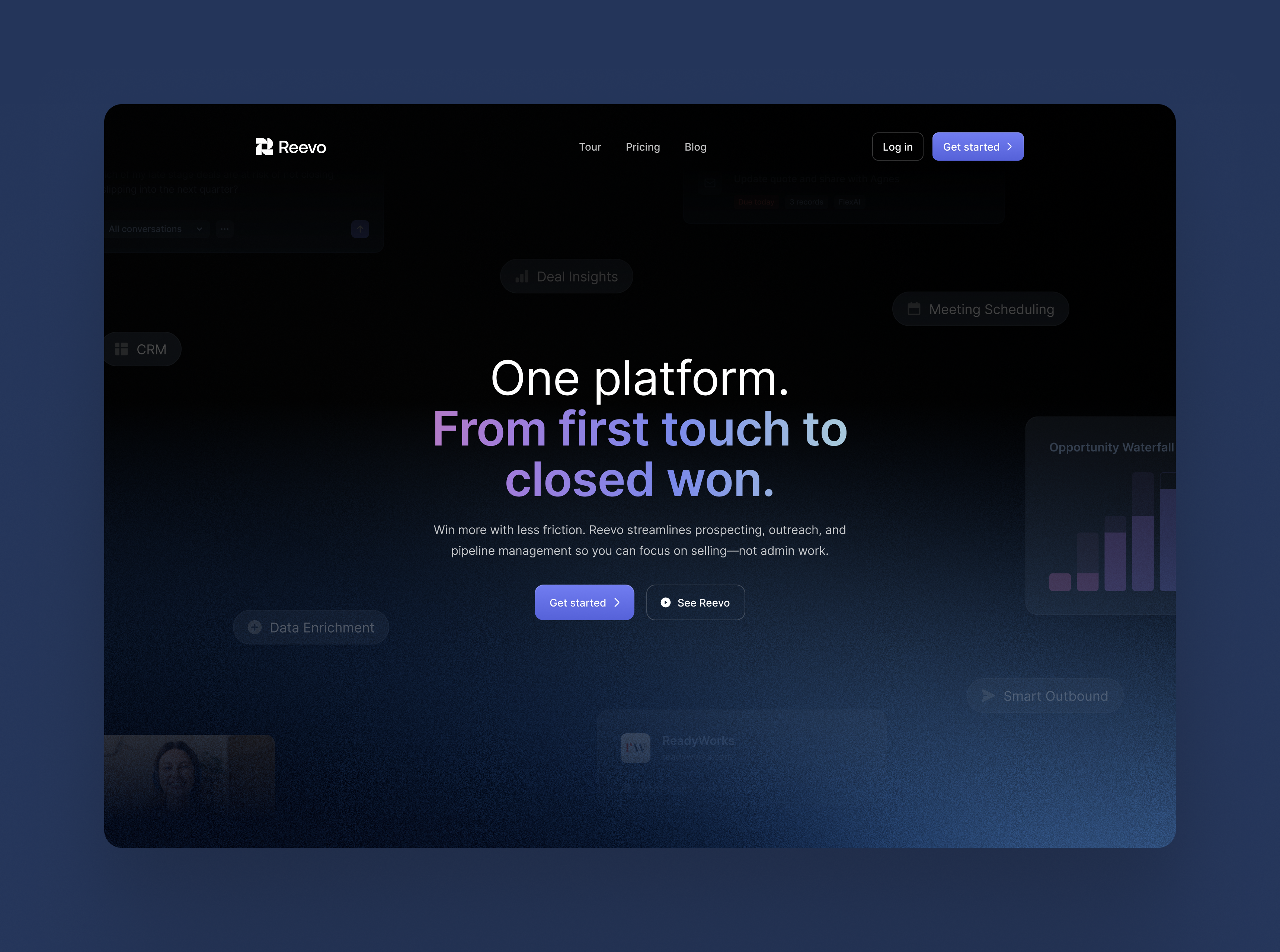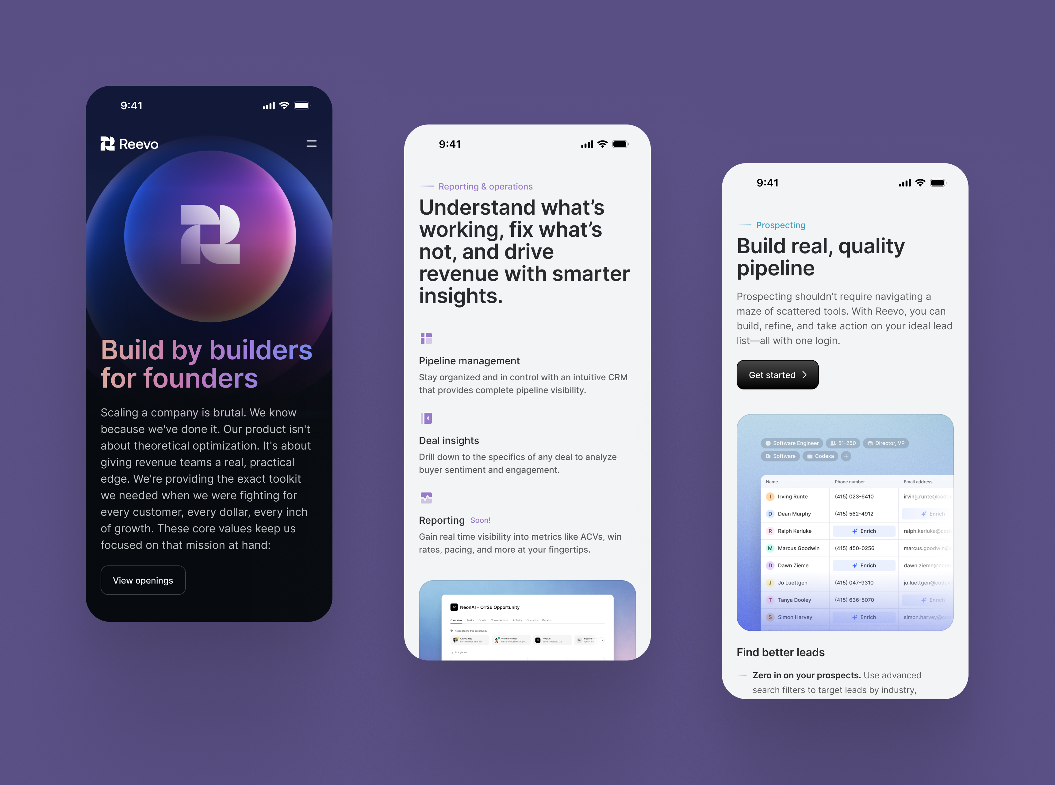 Reevo is a CRM that streamlines prospecting, outreach, and pipeline management. I was tasked with designing and building their inaugural marketing website.